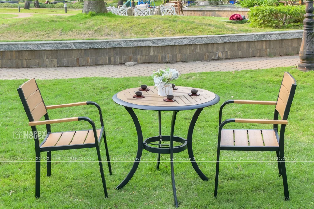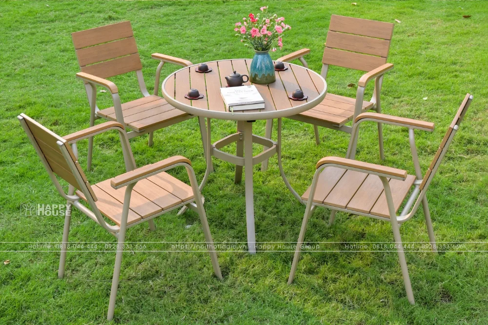 Dòng bàn ghế nhựa Composite giả gỗ mang đến vẻ đẹp tự nhiên như gỗ thật nhưng lại có độ bền cao hơn nhờ khả năng chống nước, chống mối mọt tốt. Thiết kế mang hơi hướng cổ điển, sang trọng giúp không gian quán trở nên ấm cúng và gần gũi hơn. Đây là lựa chọn phù hợp cho những quán cafe sân vườn hoặc không gian xanh muốn giữ nét tự nhiên nhưng vẫn đảm bảo độ bền sử dụng lâu dài.