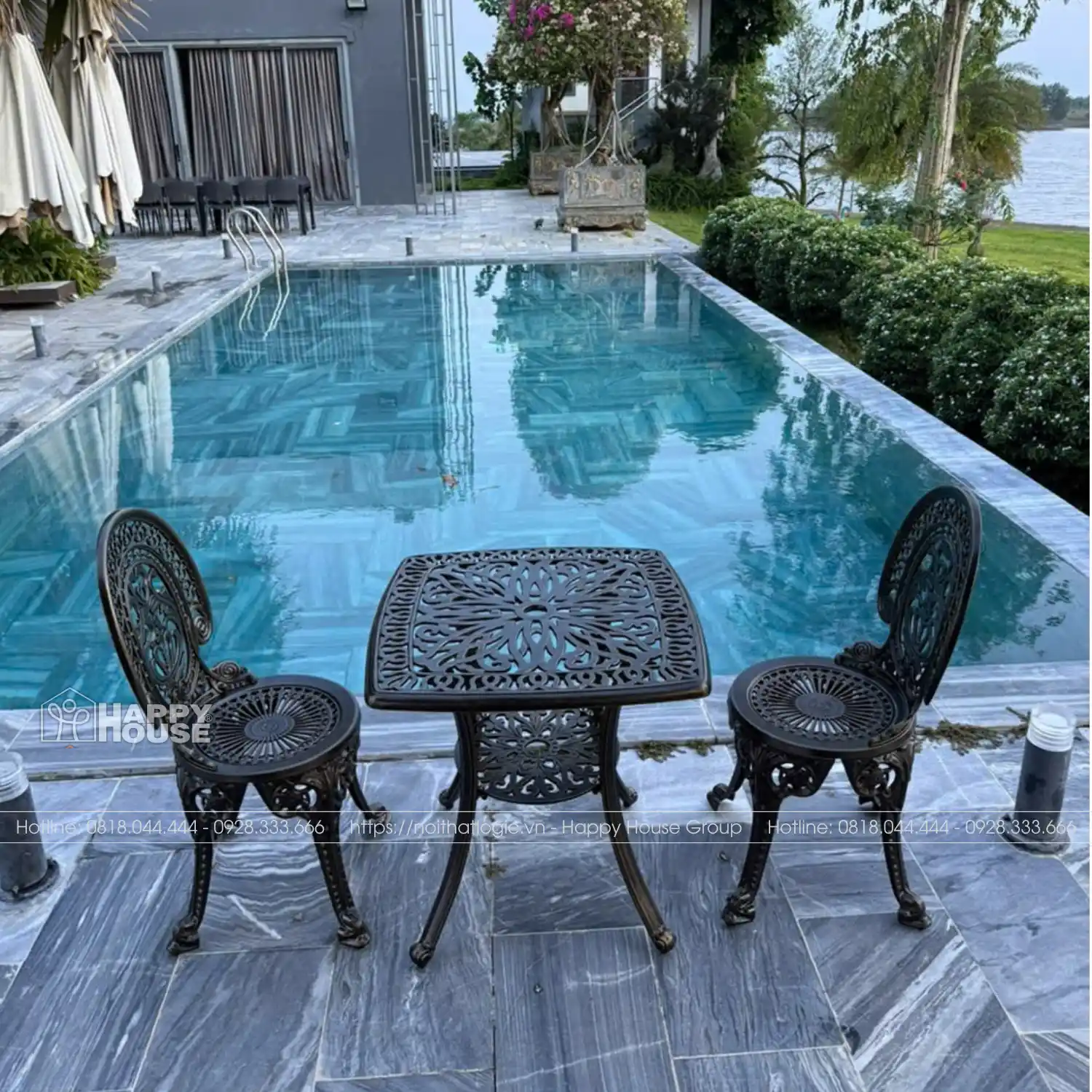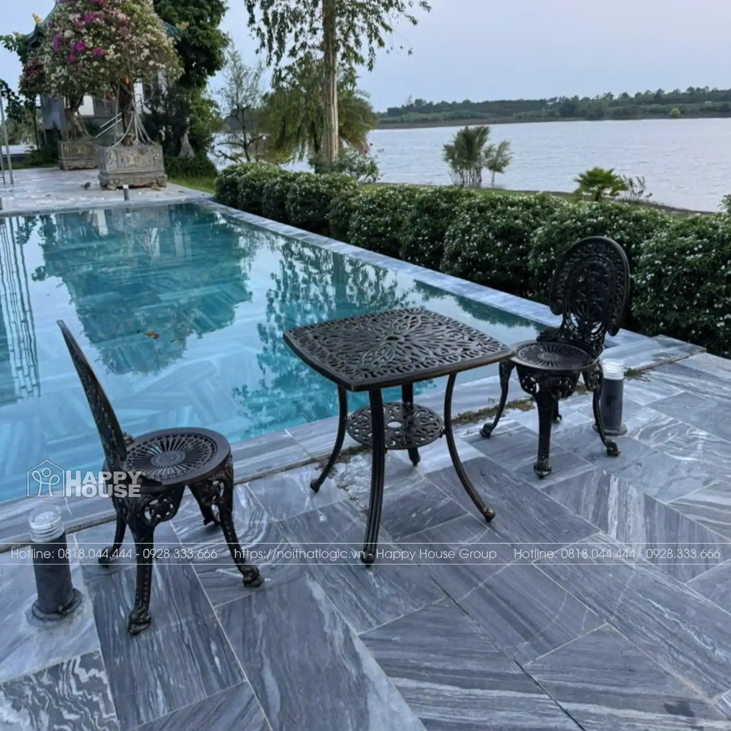 Bộ bàn ghế nhôm đúc nghệ thuật tạo điểm nhấn cổ điển bên mặt nước xanh ngắt