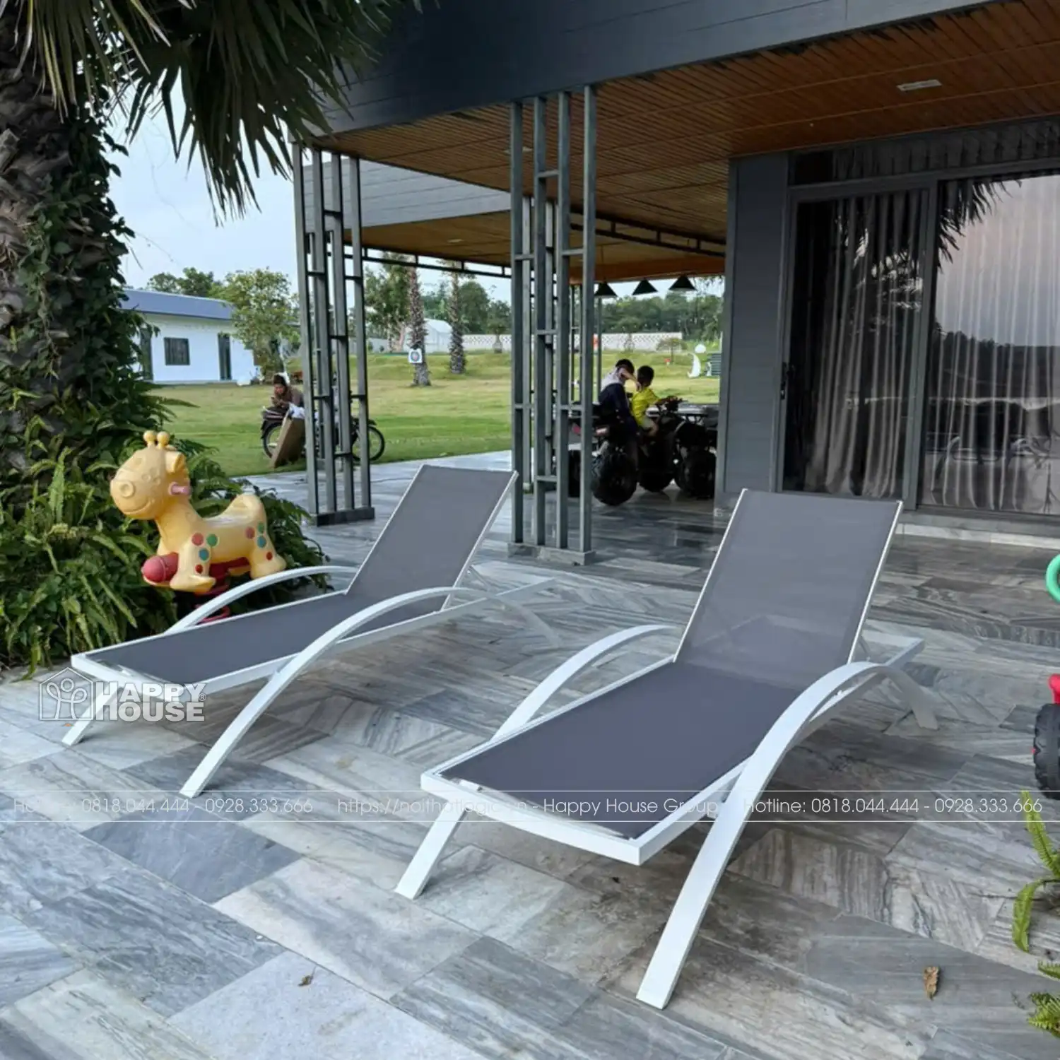 Đối với khu vực nghỉ ngơi ven hồ và hiên nhà, dòng ghế tắm nắng khung nhôm trắng được ưu tiên sử dụng.
