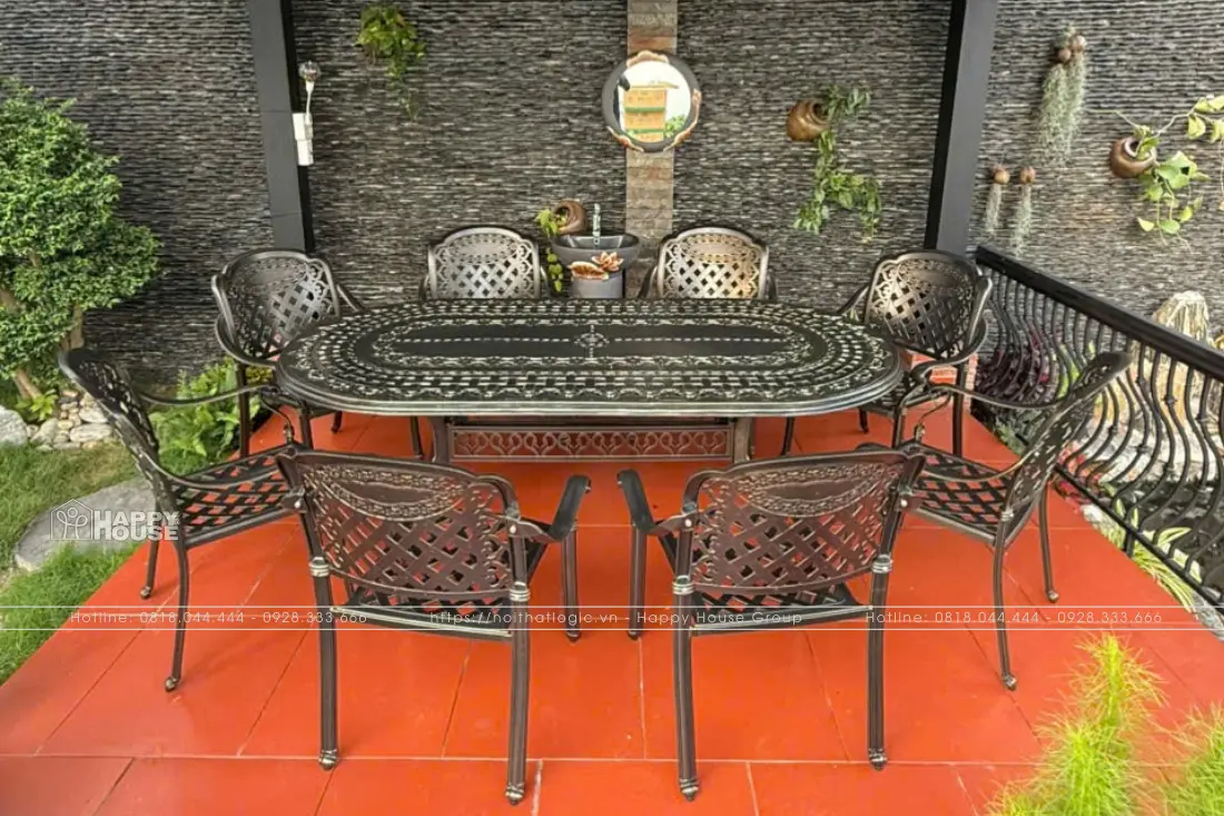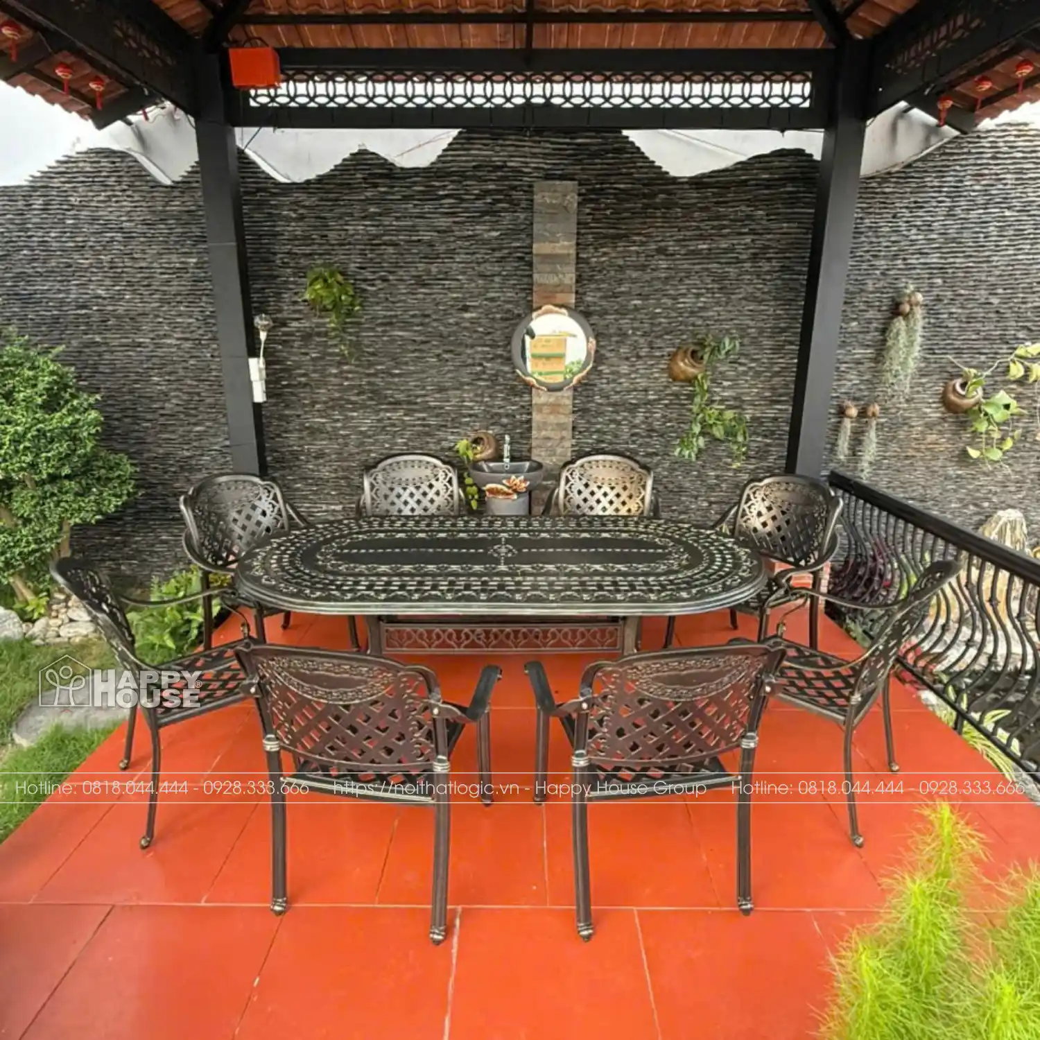 Thiết kế: Mặt bàn oval lớn với hoa văn cắt CNC tinh xảo, đi kèm 8 ghế có tay vịn thoải mái, tạo nên không gian ấm cúng cho những bữa tiệc gia đình ngoài trời.