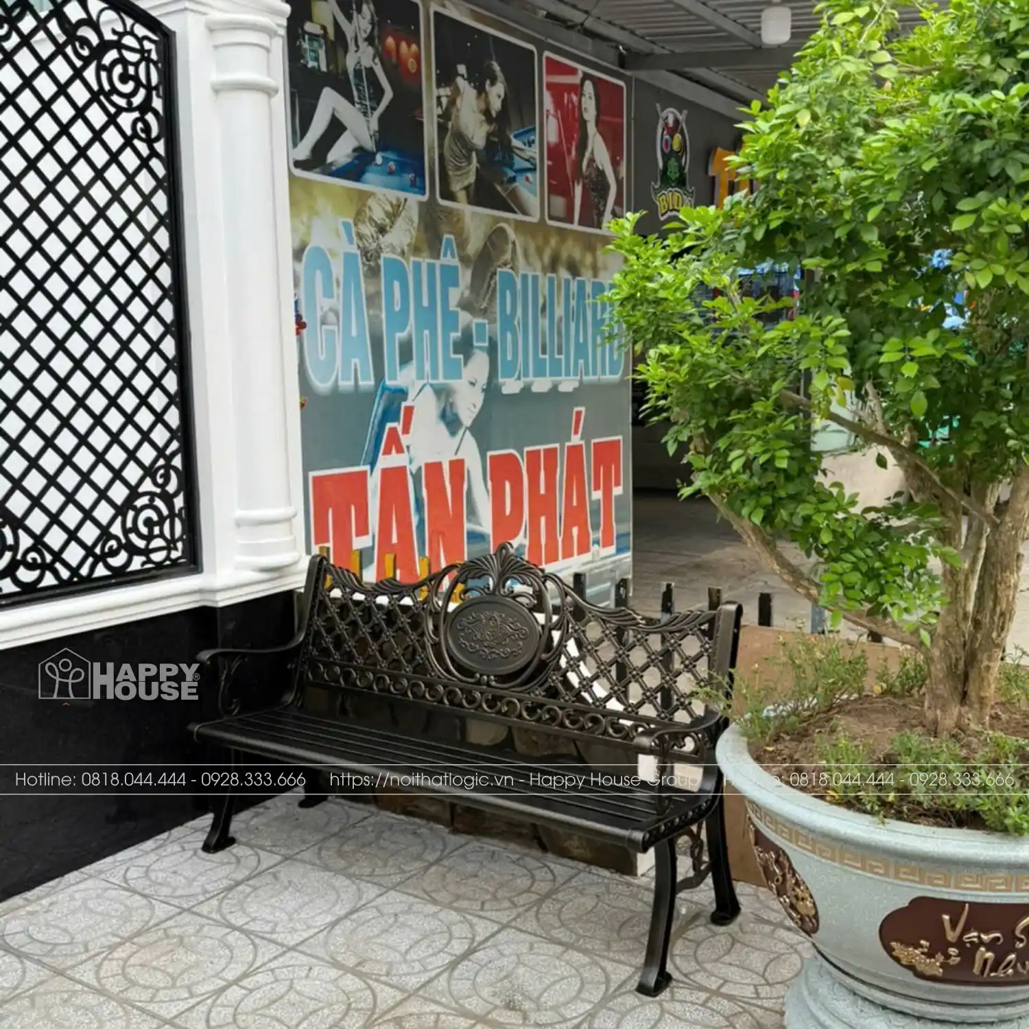 Tại khu vực lối đi gần khu vực Cà phê - Billiards của gia chủ, một chiếc ghế băng dài nhôm đúc màu đồng cổ điển đã được bố trí.
