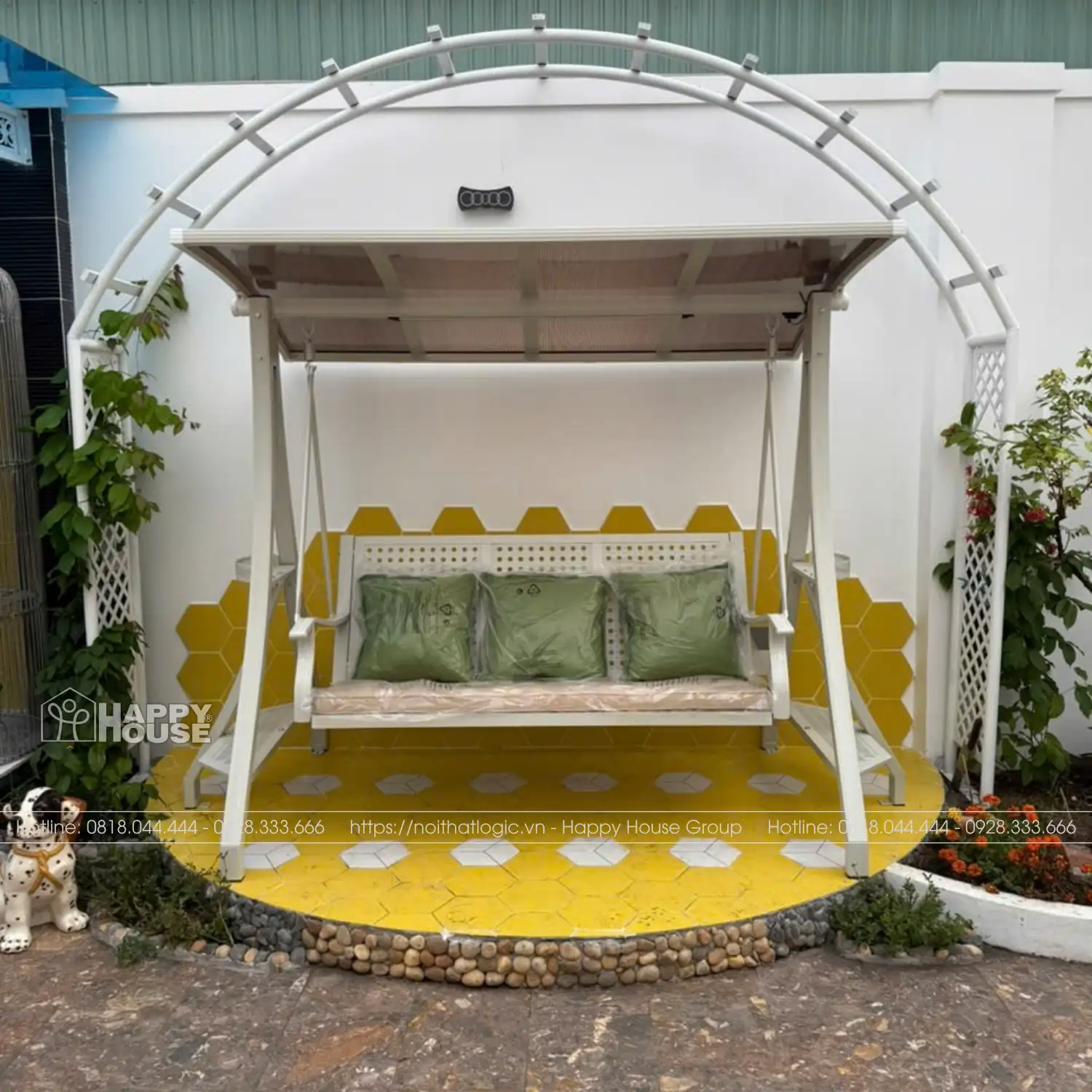 Điểm nhấn: Thiết kế có mái che tích hợp, đi kèm gối tựa lưng êm ái. Đặc biệt, phần sàn được lát đá tổ ong vàng nổi bật, kết hợp cùng mái vòm trang trí, tạo nên một "góc sống ảo" cực chất ngay trong chính ngôi nhà của bạn.