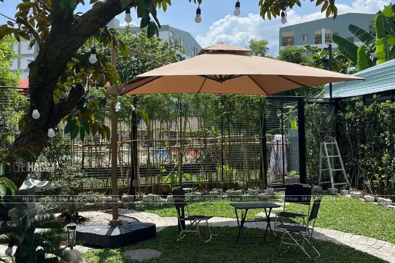 Sản phẩm dù lệch tâm được đặt tại vị trí trung tâm của khu vực nghỉ chân, kết hợp với bộ bàn ghế ngoài trời nhỏ gọn, tạo nên một khu vực ăn nhẹ/uống trà ngoài trời hoàn hảo.