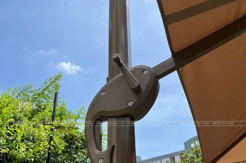 Đế dù: Đế lớn, chắc chắn, đảm bảo dù đứng vững vàng, tích hợp hệ thống quay/nâng hạ tiện lợi.