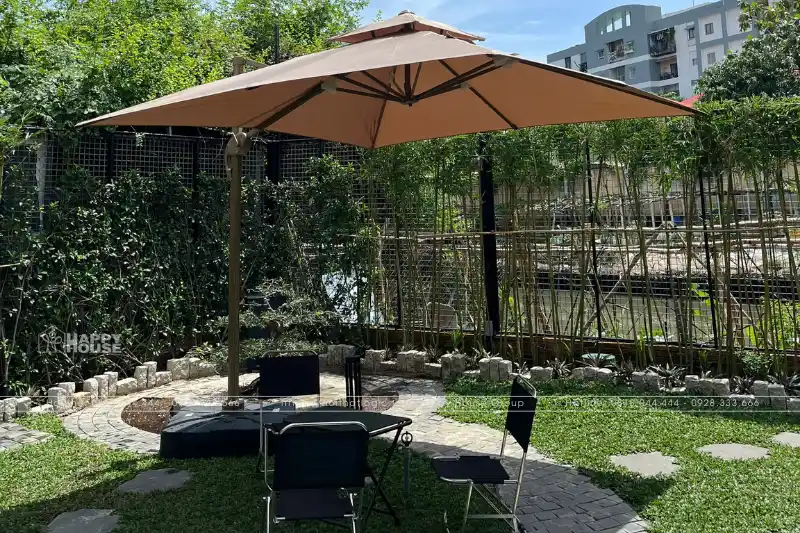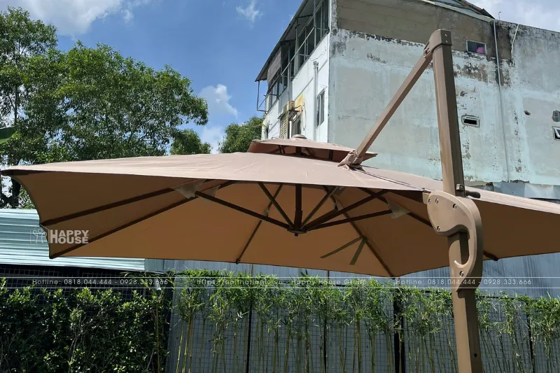 Màu sắc tinh tế: Tông màu Nâu Be (Tan/Mocha) của tán dù hòa hợp tuyệt đối với màu xanh của cây cỏ và nền gỗ/đá lát, tạo cảm giác ấm cúng, sang trọng.