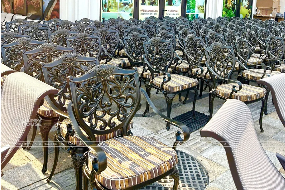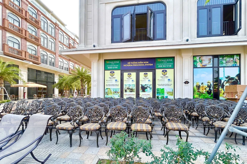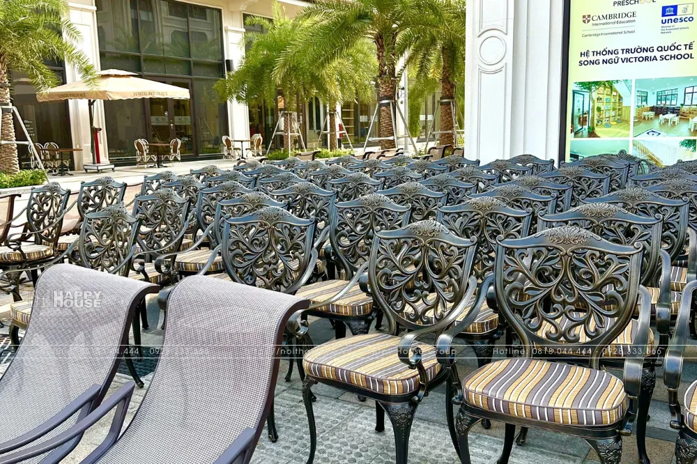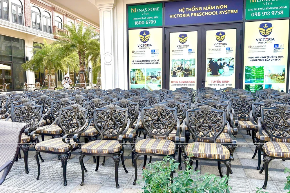 Bàn Ghế Nhôm Đúc Đẳng Cấp: Hàng trăm bộ bàn ghế nhôm đúc, thiết kế thanh lịch, phù hợp với không gian ban công của các căn nhà liền kề Menas Zone. Sự đồng bộ trong thiết kế tạo nên một diện mạo ngoại thất nhất quán, gia tăng vẻ đẹp thẩm mỹ cho toàn bộ dự án.