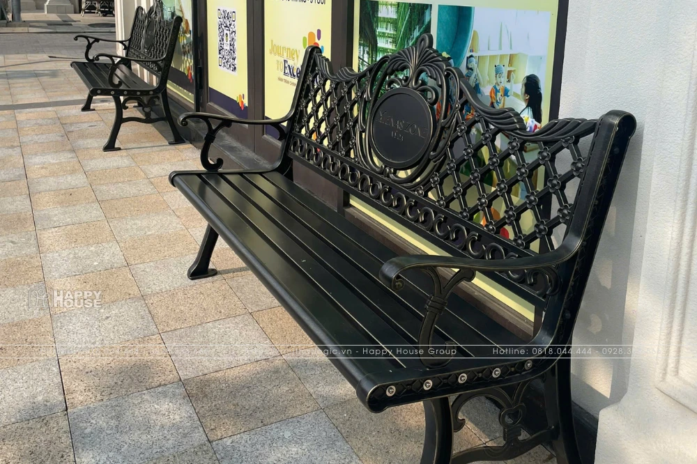 Ghế Băng Nhôm Đúc Sang Trọng: Các mẫu ghế băng nhôm đúc với thiết kế hoa văn vương miện cổ điển tinh xảo được khắc riêng logo Menas Zone Vỹ Dạ tạo nét riêng ấn tượng, màu sắc sang trọng, được bố trí dọc các lối đi, khu vực sảnh chờ, tạo điểm nhấn nghệ thuật và mang lại sự tiện nghi cho cư dân và du khách khi dừng chân nghỉ ngơi.