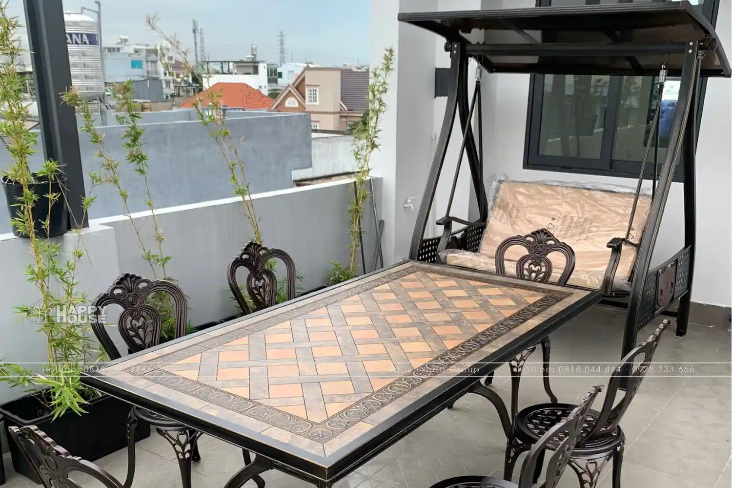 Tổng Quan Không Gian Dự Án Dự án được thực hiện tại một căn nhà phố ở Quận 12, TP.HCM, biến khu vực sân thượng thành một không gian thư giãn và ẩm thực ngoài trời lý tưởng. Sản phẩm bao gồm Bộ Bàn Ghế Ăn Nhôm Đúc 6 Ghế và Xích Đu 2 chỗ Thư Giãn Có Mái Che